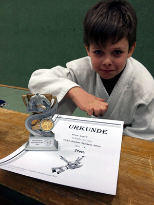 Im Finale, nun auf Philips Tokui-waza (Spezialtechnik) vorbereitet, traf er erneut auf den starken 4.Kyu. Zuerst sah es nicht vorteilhaft für uns aus. Eine Gake-Technik die fälschlich als Tani Otoshi (Talfallzug, noch nicht erlaubt in der U 12) ausgelegt wurde, brachte ihm den ersten Shido (kleine Strafe). Es blieb jedoch nicht der einzige in diesem Kampf. Mit aller Macht versuchte sein Gegner die linke Hand abzuwehren, die sich immer wieder zur Spezialtechnik durcharbeiten wollte und drängte den Gegner somit zum abgebeugten Kämpfen, was ebenfalls mit Shido bestraft wurde. Dann nach zwei Minuten die Erlösung, Philip setzt sich durch und erreichte mit fünf Siegen in Folge den ersten Platz.