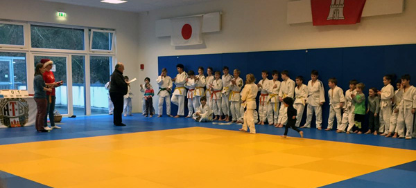Eine Judo-Medaille soll es sein, oder wie fragte Anni: „Wenn ich drei oder viermal gewinne, bekomme ich dann einen Goldtaler?“ Aber der Reihe nach, die Jugendleitung hatte wie jedes Jahr kurz vor Heiligabend zum Weihnachtsturnier eingeladen. Diesem Aufruf folgten neben rund 40 HTB-Judoka auch die beiden Nachbarvereine FSV und TSV Westerhof mit einer kleinen Delegation. Deren Trainer Felix und Sebastian sind gern gesehene Gäste und da war es naheliegend, dass sie nun auch Kinder zu unserem Turnier schickten. So wurden dann nach toller Vorarbeit von der Jugendleitung die Listen von Ralf erstellt und mit leichter Verzögerung und kleinen Startschwierigkeiten konnte es dann - in 11 Gewichtsklassen aufgeteilt - losgehen.