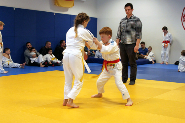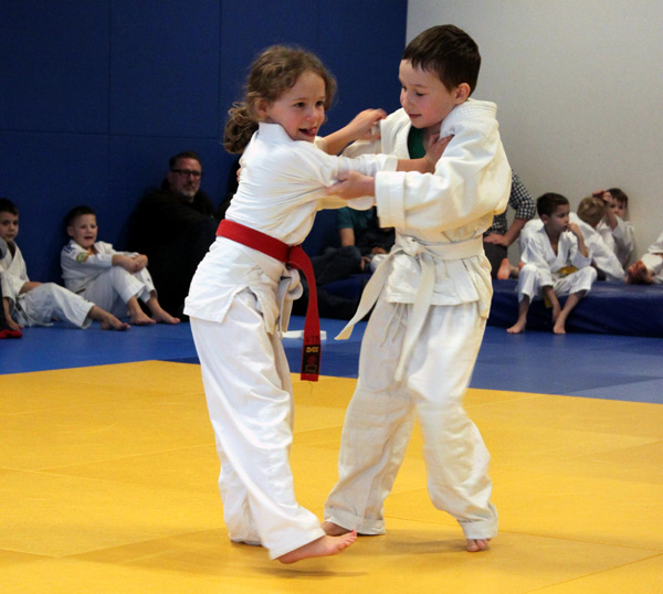 Allen voran hatten 10 Kinder aus der „Eltern – Kind – Gruppe“ von Trainerin Gabi sich angemeldet und kämpften in der besonderen Form der Sumotori (eine japanische Ringerform = Sumo), es fehlte nur der entsprechende Bauch und die entsprechende Kleidung. Auf einer abgegrenzten Fläche von 3 x 3 m sollte versucht werden, den Partner aus dieser Fläche zu schieben. Das Judo-Prinzip – „Siegen durch Nachgeben“ – konnte nicht besser gezeigt werden. Wirklich viel Mut und Kampfgeist zeigten dann Nimrod S., Mateo K., Alexander, Gerson, Yozandro, Nikolas P., Erik Sch., Nikita P., Eser E. und Elyas E.. Der Lohn für Mut und Erfolg war eine Goldmedaille und ein Kleingeschenk für jeden. Die Geschenke durften von einem großen Tisch ausgesucht werden, auch das war fast ein Kampf, sich dabei zu entscheiden. Nathalie und Schwester Vanessa B. halfen aber liebevoll.